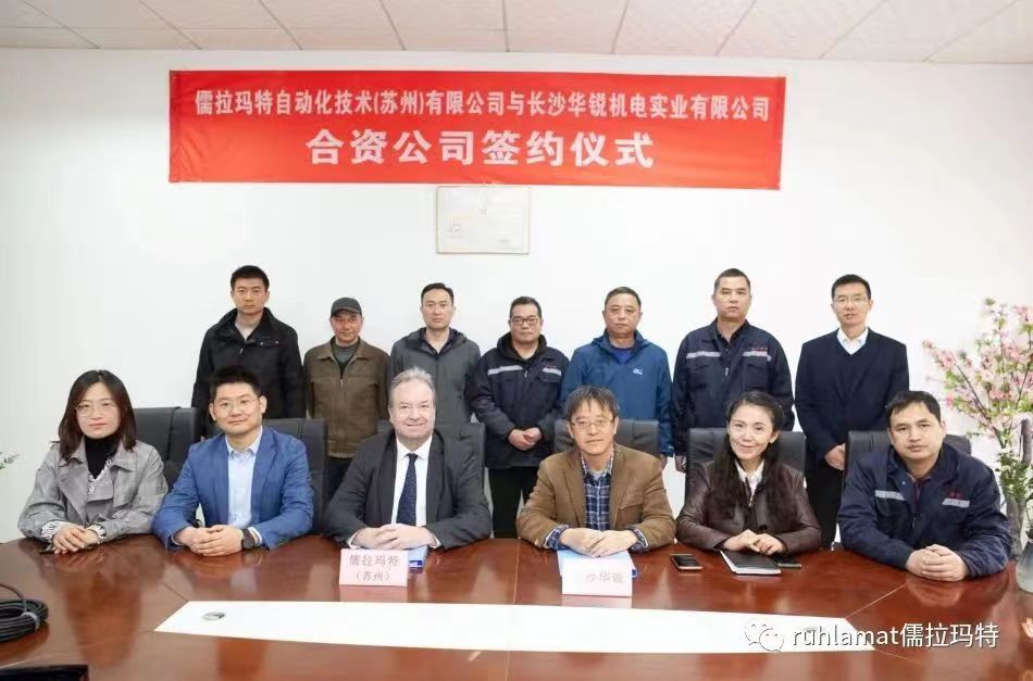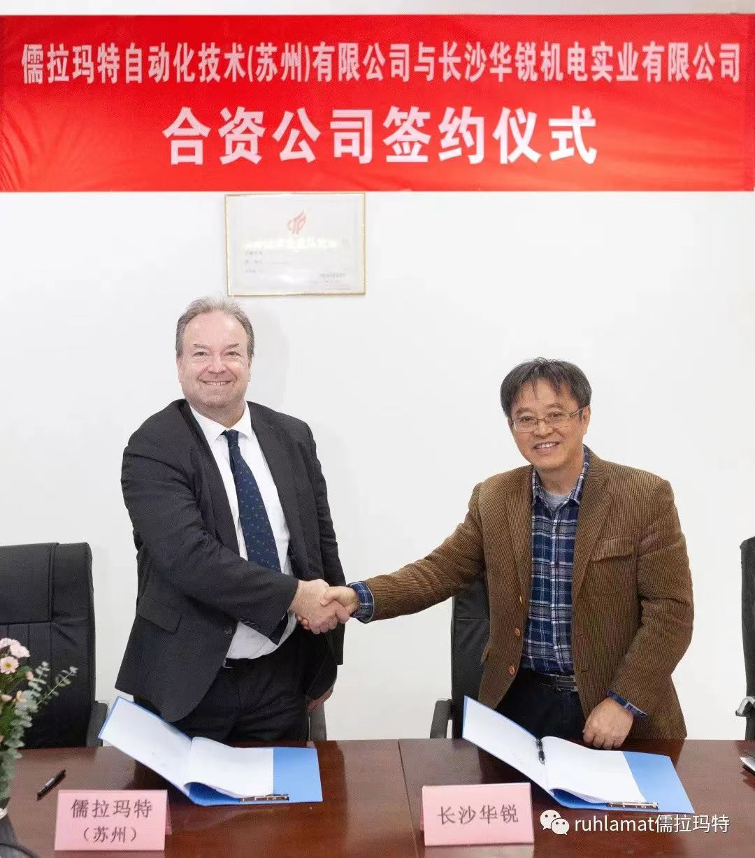 儒拉瑪特自動化技術(蘇州)有限公司與長沙華銳機電實業(yè)有限公司在長沙舉辦了合資公司簽約儀式,儒拉瑪特(蘇州)董事總經(jīng)理白世泰先生與長沙華銳總經(jīng)理王小明先生簽署合作協(xié)議。